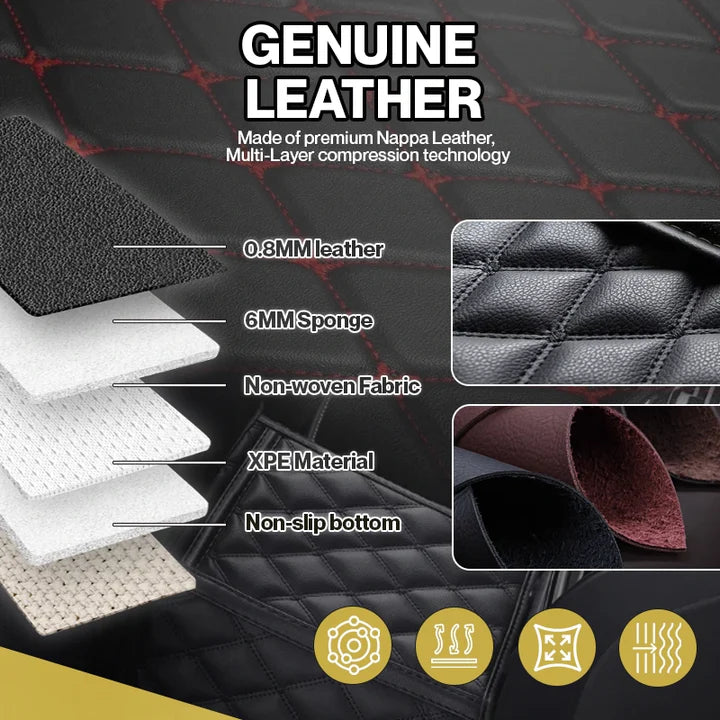 Made out of ultra-durable vegan leather, soft memory foam, polypropylene resin with hard wear properties and honeycomb anti-Skid Base, our car mats keep water and moisture away from your vehicle floor. Provide anti-skid protection when driving.